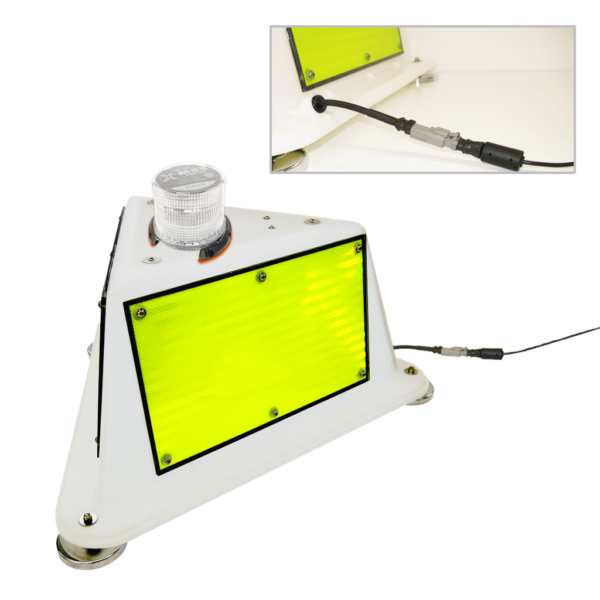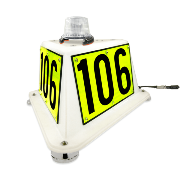 HEAVY DUTY, HI-VISIBILITY 3 Sided Backlit Display with 8.3'' Black Text on a Reflective Fluorescent Yellow-Green Background Includes a Green Strobe 3M Diamondgrade Reflective for Easy Night-time Visibility when equipment is turned off. High illumnation internal LED lighting for night time visibility. Water and weather resistant. Field proven for over 15 years to survive extreme environments.