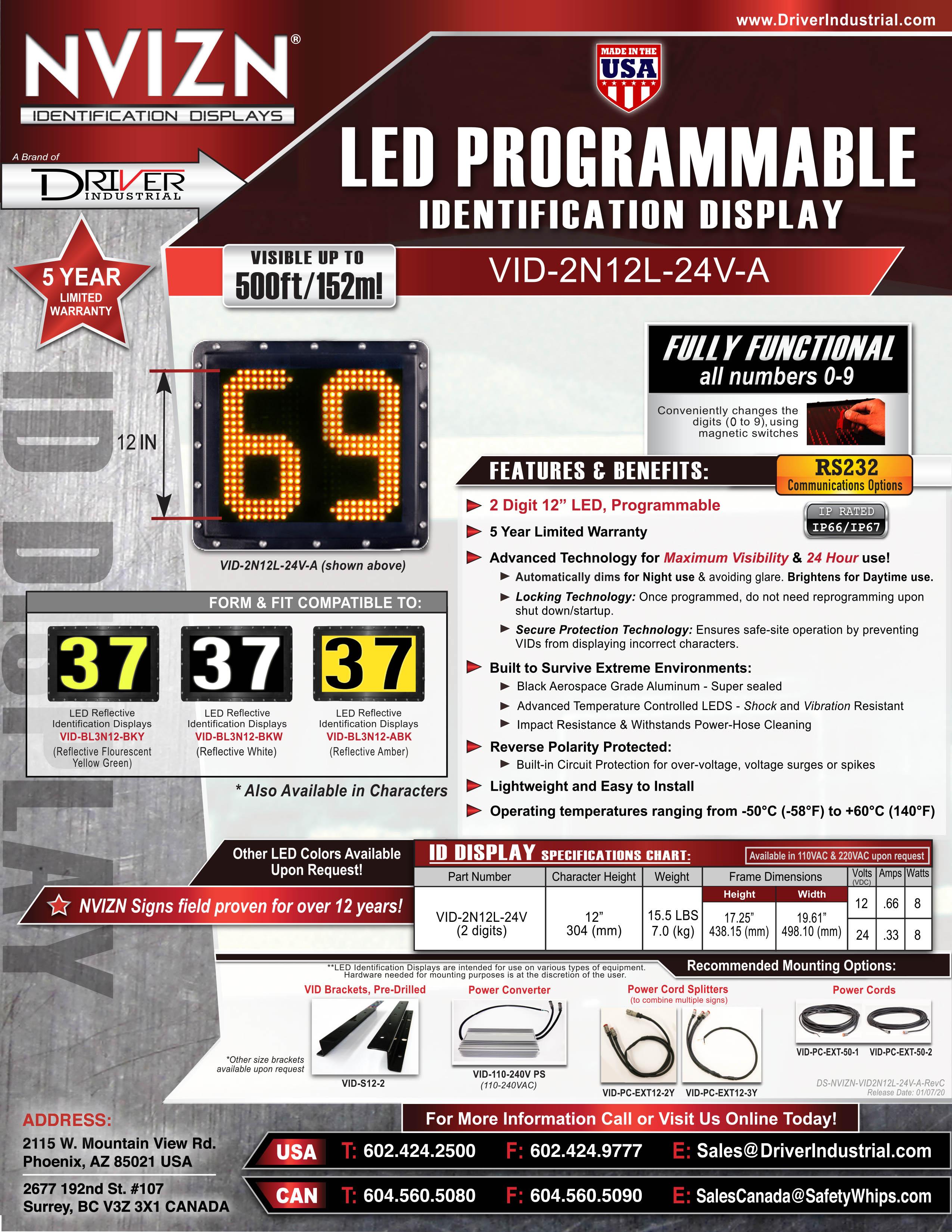 NVIZN LED Programmable Identification Display options are the most efficient form of LED display. Recognized globally for dependability, high visibility, and programmable functionality. Programmable displays provide the most robust and efficient way to identify vehicles and Heavy Equipment with Vehicle ID Numbers. NVIZN Identification Displays® are heavy duty fully functional displays available in 5 Types of Displays: Programmable LED, Messaging and Signaling, Reflective LED Backlit, 3-Sided Displays and Interchangeable LED Reflective Backlit and are available in various character sizes dependent on the type of display. Sizes for our different Types of Displays range from 9″, 12″, 18″, 24″, 36″, to 52″ dependent on display type. All Types of our NVIZN Identification Displays® are Mine-Tough and are built to survive the most extreme harsh environments; they are super sealed to be extremely durable to withstand power-hose cleaning, and are made of Hard Anodized Black Aerospace-Grade Aluminum framing and other lightweight materials making all of our products light weight and easy to install. NVIZN Identification Displays® have an Industry Leading 5 Year Limited Warranty.