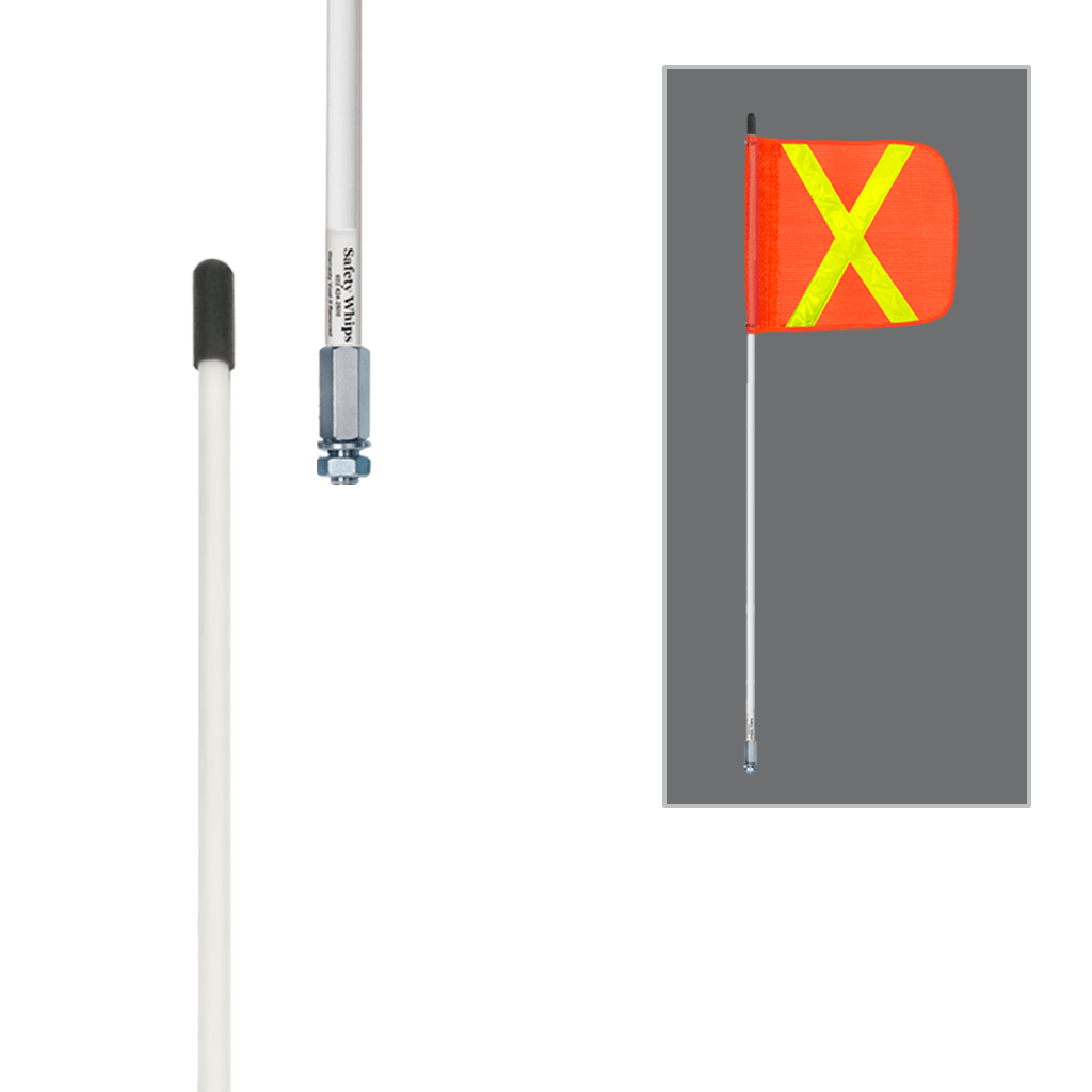 3' Heavy Duty, All Weather Fiberglass Warning Whip. The Whip Diameter is 1/2" This 1 Piece Non-Powered whip and has a Threaded base on the bottom. This whip includes an Orange Mesh 11.5" x 11.5" flag with a Yellow Reflective ''X''.