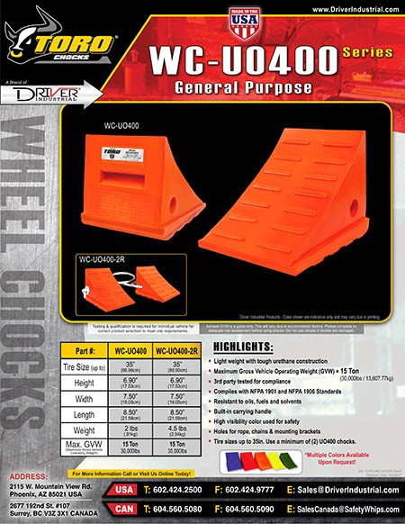 Product Line Information | 000 lb. or 13, 607 kg.)., TORO® 400 Series Wheel Chocks are for vehicles and equipment with a tire size of 35-inch in diameter and maximum Gross Vehicle Operating Weight (GVW) of 15 Ton (30 |