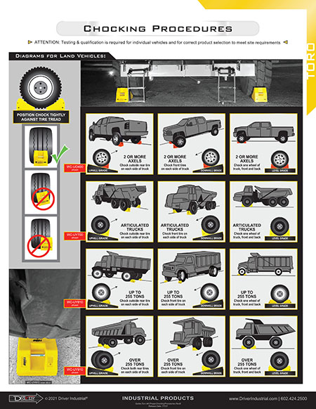 TORO® 400 Series Wheel Chocks are for vehicles and equipment with a tire size of 35 in diameter and maximum Gross Vehicle Operating Weight (GVW) of 15 Ton (30,000 lb. or 13,607 kg.).