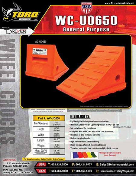The General Purpose line of TORO® Wheel Chocks are engineered for quick and secure installation typically used for land vehicles such as trailers, pickups, utility vehicles and other standard size vehicles. Constructed with tough Urethane for lightweight and easy mobility, high visibility ANSI compliant safety colors and holes for mounting with rope, chains, or mounting brackets. All model styles are 3rd-party tested for compliance and supporting GVWs (Maximum Gross Vehicle Operating Weight) ranging from 15 Ton (30,000 lb. or 13,607 kg.) to 35 Ton (70,000 lb. or 31,751 kg.) and maximum tire diameter sizes of up to 46 inches (116cm). * If you need larger wheel chocks visit our Heavy Equipment product line