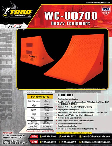 The Heavy Equipment line of TORO® Wheel Chocks are heavy duty and engineered to safely secure heavy equipment vehicles such as haul trucks, loaders, cranes, fire department vehicles, large military trucks, and heavy underground mining vehicles. Constructed with tough Urethane for lightweight and easy mobility with built-in strong carrying handle on the back side of each wheel chock. These large chocks are highly visible (ANSI compliant safety colors) with user-friendly mounting brackets for quick and secure loading on the vehicle. All model styles are 3rd-party tested for compliance with Maximum Payload Capacities ranging from 70 Ton (140,000 lb. or 63,502 kg.) to 400 Ton (800,000 lb. or 362,873 kg.) and maximum tire diameter sizes of up to 165 inches (419cm).