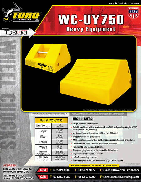 Product Line Information | cranes, fire department vehicles, large military vehicles., loaders, The Heavy Equipment line of TORO® Wheel Chocks are heavy duty and engineered to safely secure heavy equipment vehicles such as haul trucks |